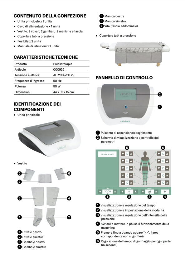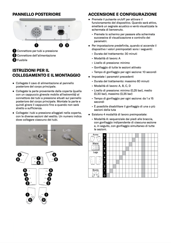 L’operatore puo’ utilizzare e scegliere tra 22 programmi memorizzati o impostare manualmente i parametri relativi al tempo , alle sequenze di gonfiaggio e sgonfiaggio , alla pressione dei vari settori di lavori e non ultimo alla durata del trattamento .